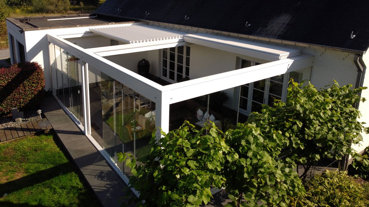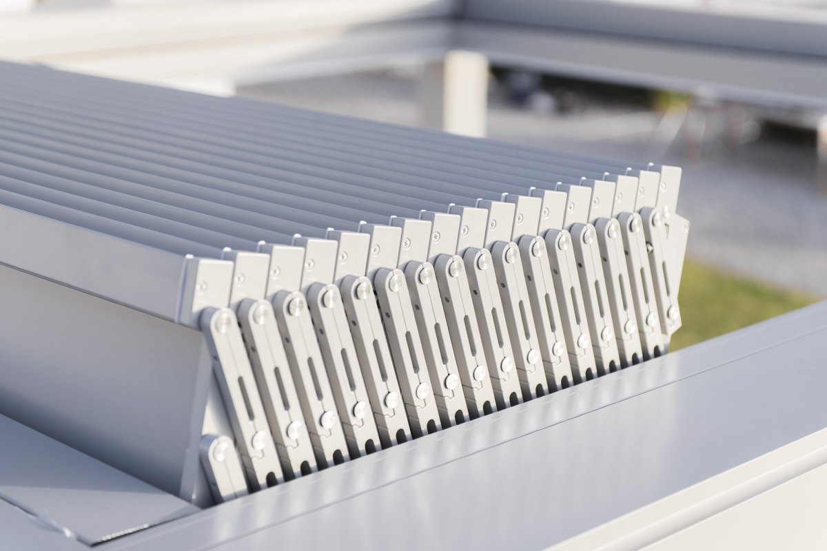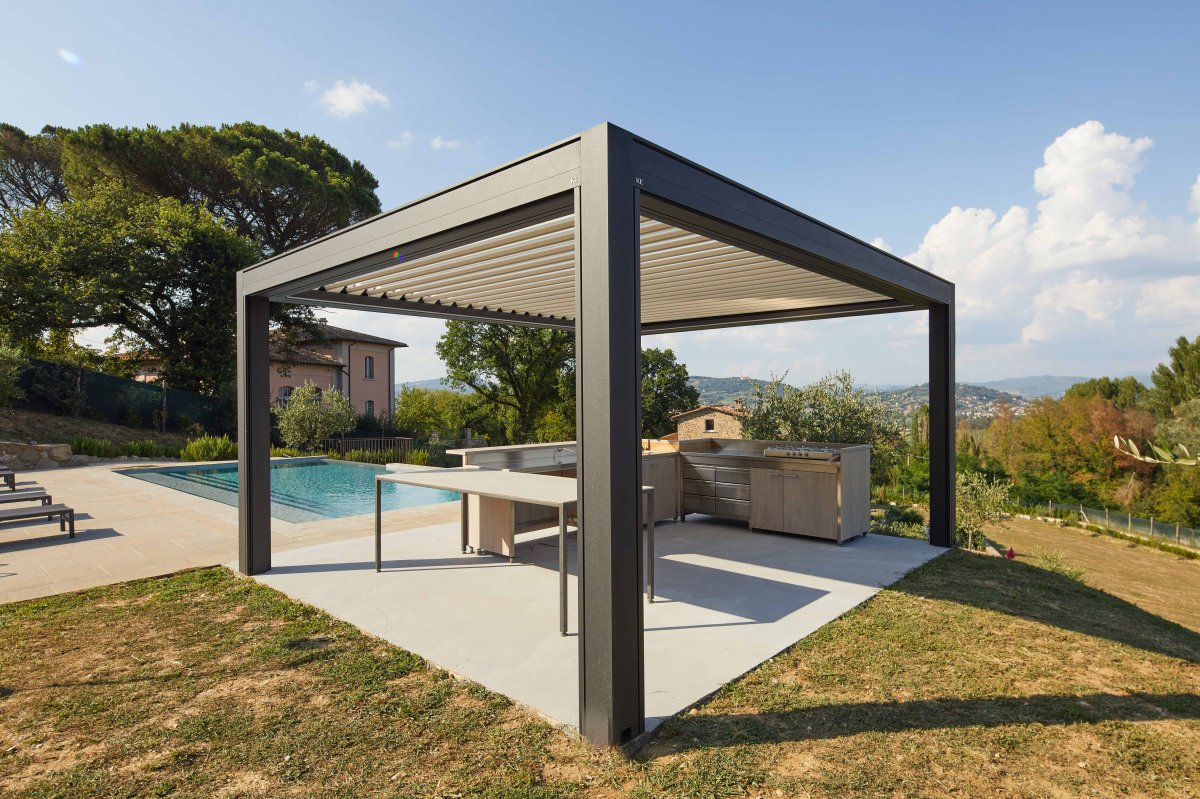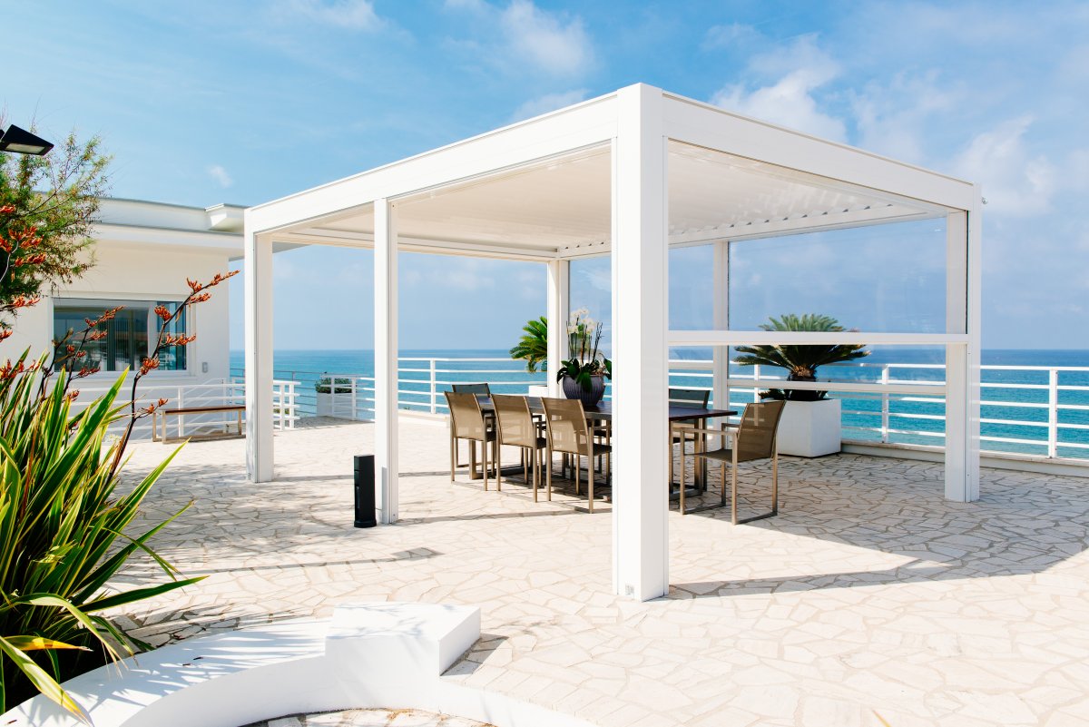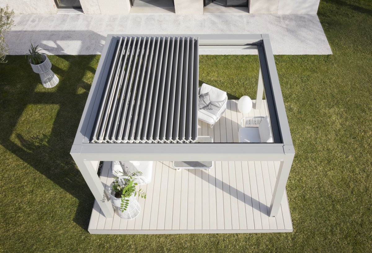 Bioclimatica in alluminio con tetto a lame orientabili, studiata per garantire massima tenuta alle intemperie. Movimentazione garantita da sistemi motorizzati robusti e affidabili. stilisticamente pulita, per la sua configurazione modulare si presta a coprire qualsiasi tipo di dehor, patio o terrazzo. chiudibile perimetralmente con tende zip o vetrate. Un sistema di raccolta acqua, grondaie perimetrali e pluviali, fa defluire l' acqua attraverso le colonne. Le lame sono state progettate per permettere l' evacuazione dell' acqua attraverso un gocciolatoio integrato. Le lame possono essere parallele o perpendicolari alla parete.Movimentazione delle lame automatizzata grazie ai sensori vento, neve e pioggia.