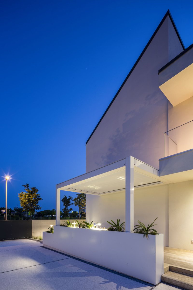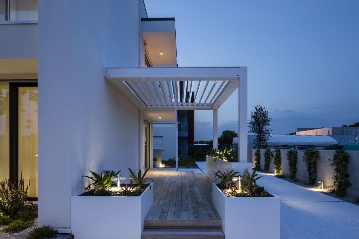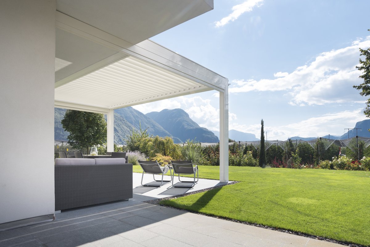 Bioclimatica in alluminio autoportante o addossata, con tetto a lame orientabili fino a 135° e movimentazione garantita da sistemi motorizzati robusti ed affidabili. Stilisticamente pulita, modulare, disponibile bicolore e dotata di chiusure perimetrali a vetrate, a zip o con tende a drappo. Massima tenuta all’acqua che viene raccolta da un sistema di grondaie perimetrali e pluviali e defluita attraverso le colonne. Elevate performance per la resistenza al vento ed ai carichi.
